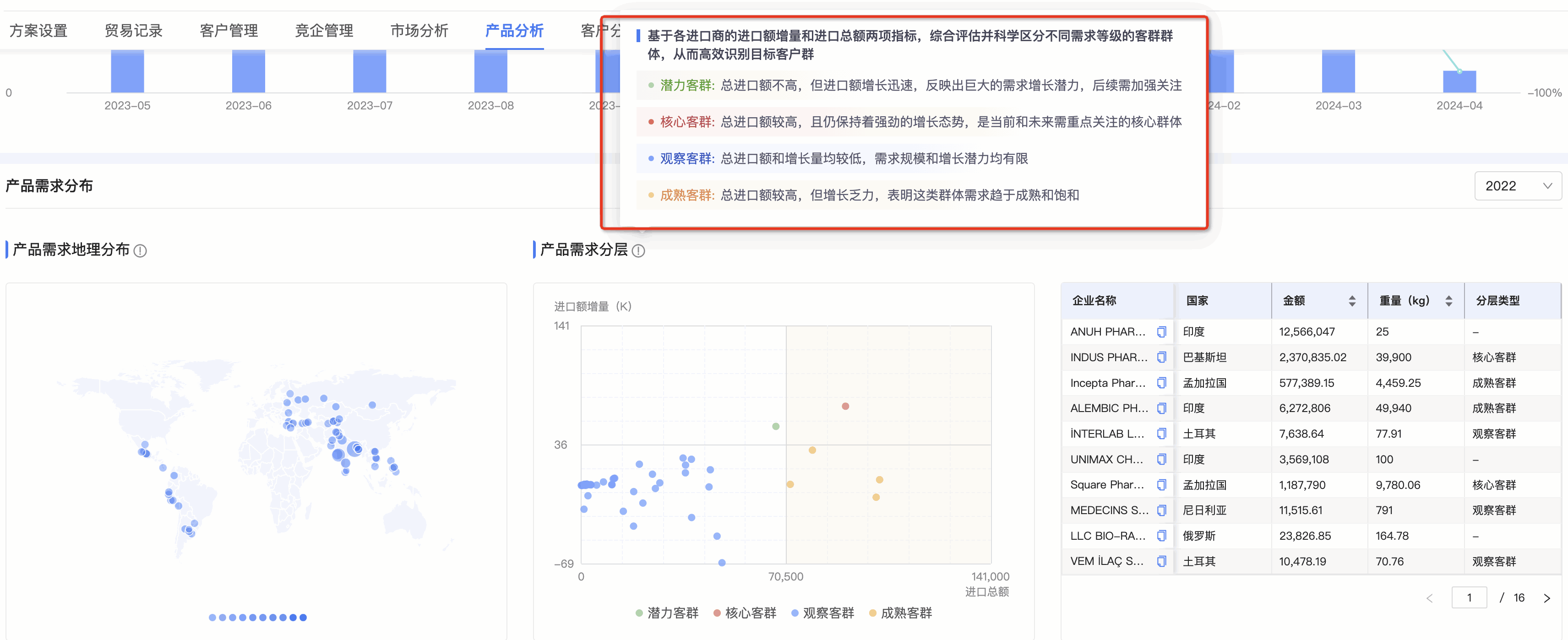 ● 产品需求分层图:Topay 钱包(中国)数据通将需求客群按照进口额增量和总额进行分层,划分为潜力、观察、成熟和核心四个层级。分层有助于用户快速锁定目标客户群体。标题旁附需求分层的解读,能让用户更直观、快速理解每个层级的特征,能够更快速的识别目标客群。